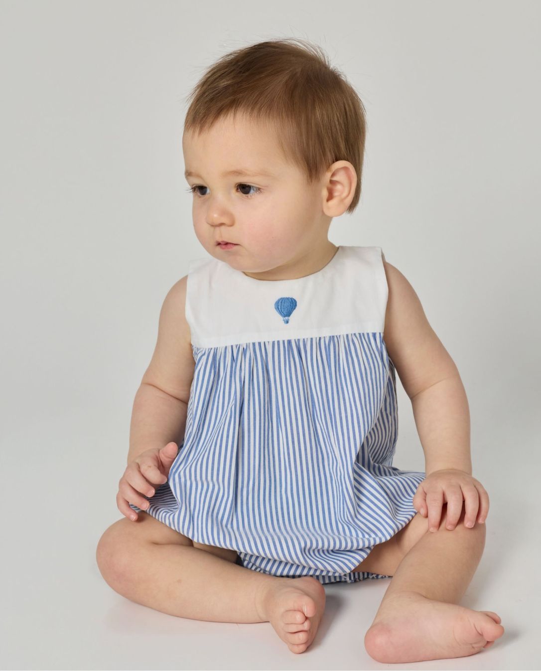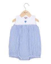 Barboteuse sans manches. Encolure ronde. Petite broderie sur le devant. Boutons pression à l'entrejambe et boutonnage dos. Tour de jambe élastiqué. Tissu seersucker coton.