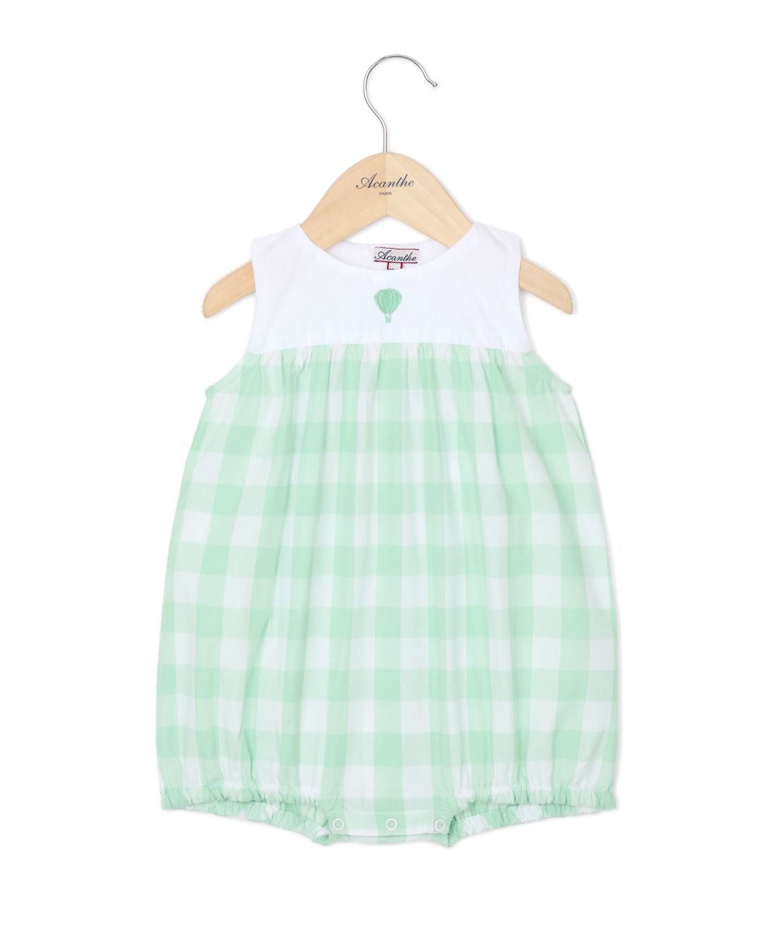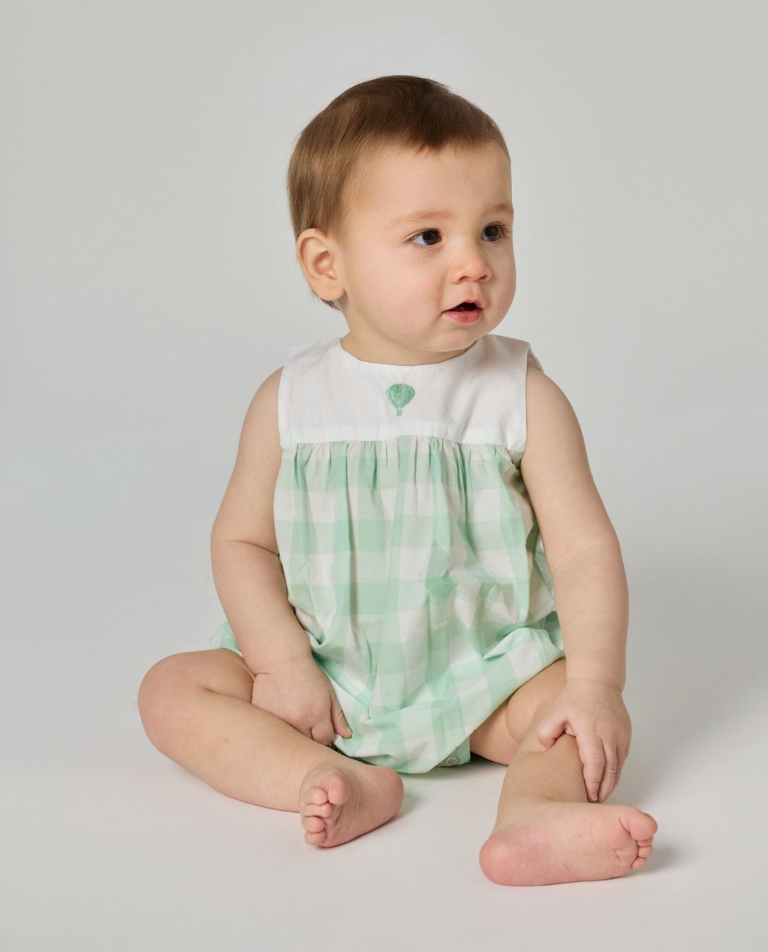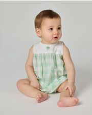 Barboteuse sans manches. Encolure ronde, sans manche. Petite broderie sur le devant. Boutons pression à l'entrejambe et boutonnage dos. Tour de jambe élastiqué. Popeline coton.