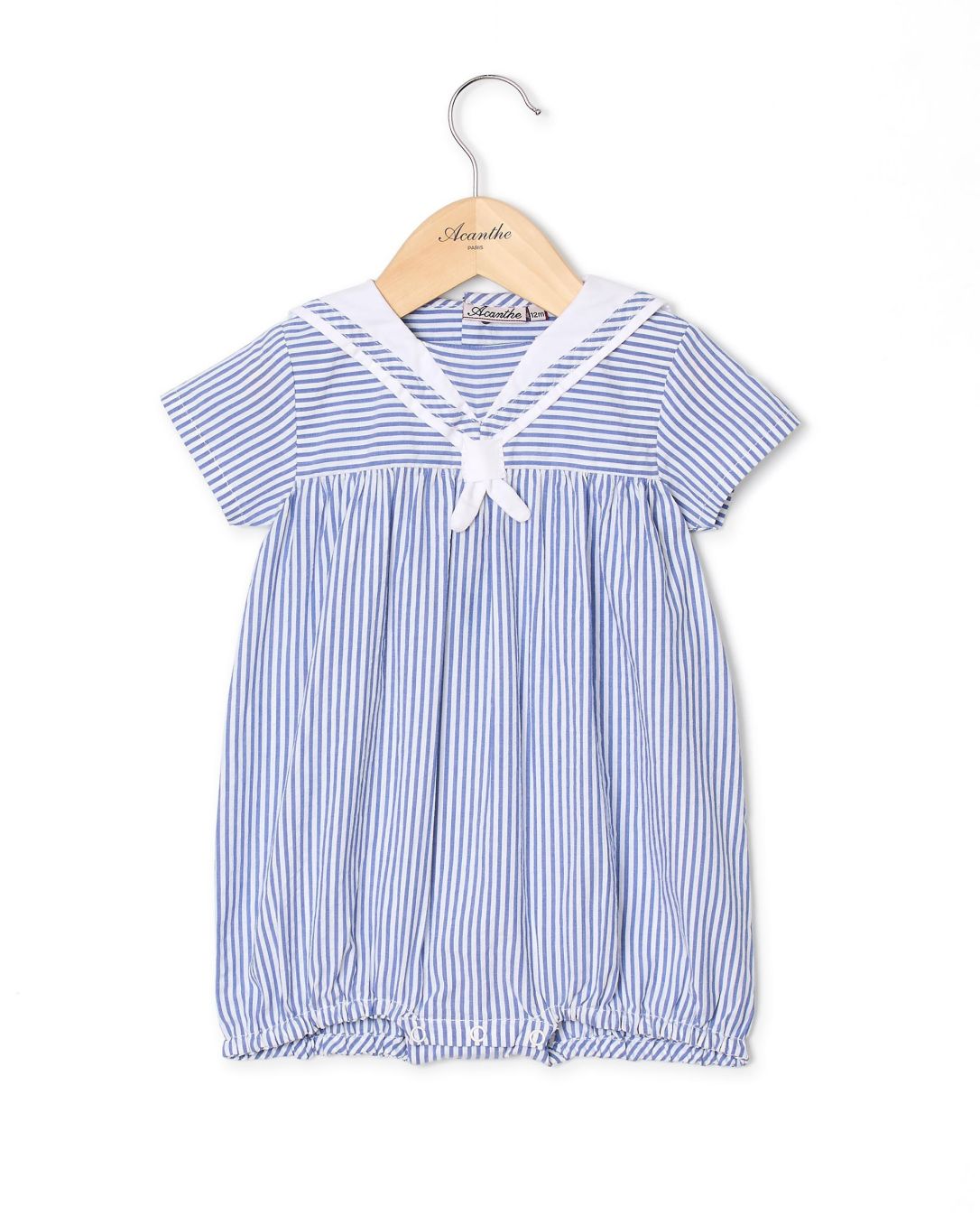 Barboteuse à petites manches. Col marin en tissu blanc. Bas froncé sous le buste. 100% coton.