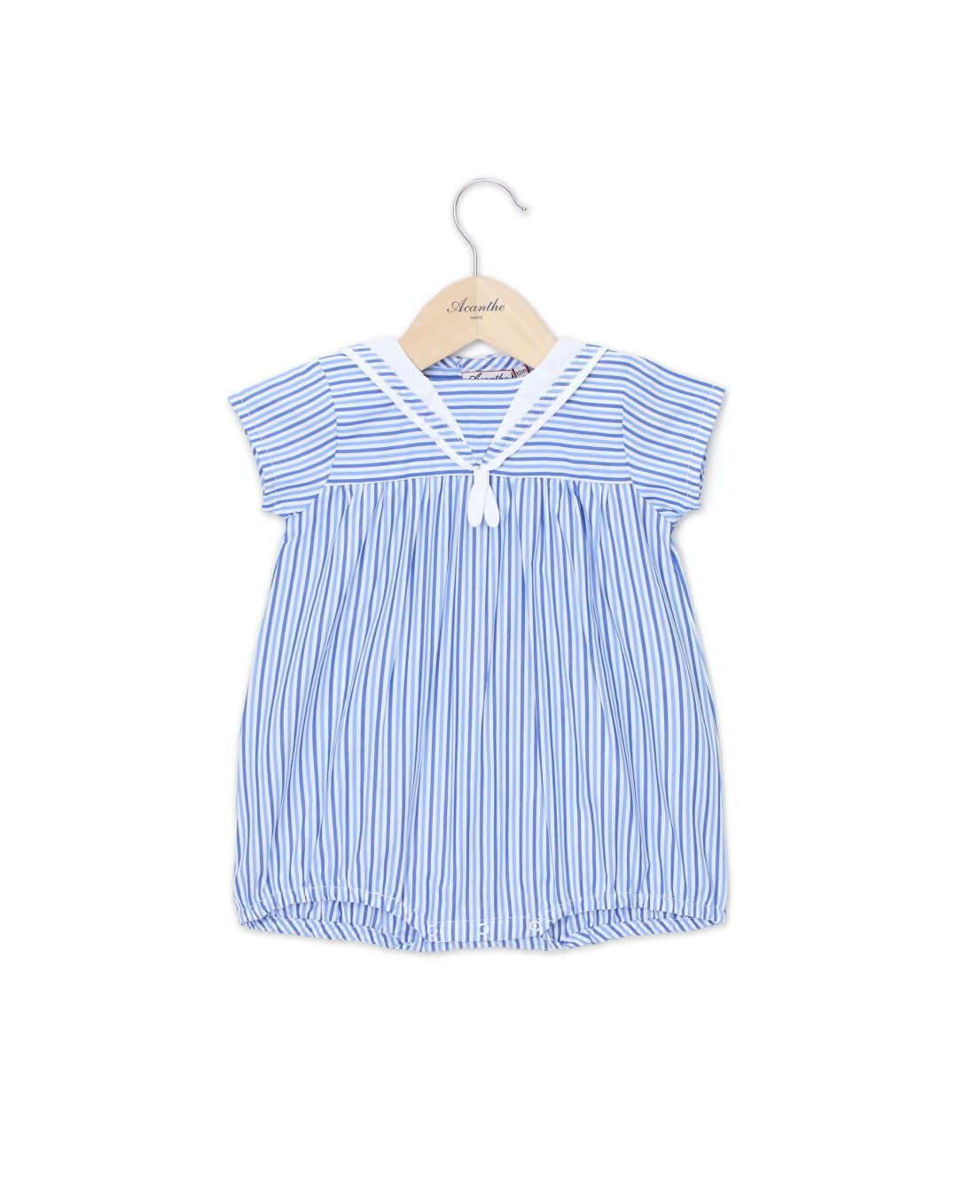 Barboteuse col marin. Petites manches. Col marin en tissu blanc. Bas froncé sous le buste. Tour de jambe élastiqué. Boutons pression à l'entrejambe et boutonnage dos.