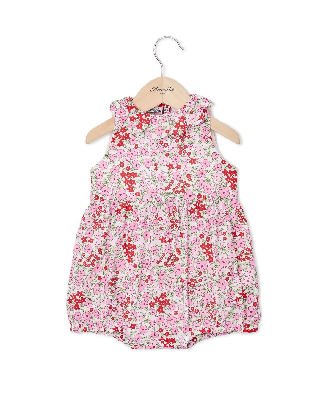 Barboteuse sans manche. Col pétale en imprimé ton sur ton. Bas froncé à partir de la taille haute. Tour de jambe élastiqué. Boutons pression à l'entrejambe et boutonnage dos. Popeline coton.