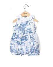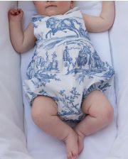 Barboteuse sans manches avec un col pétale en imprimé ton sur ton. Bas froncé à partir de la taille haute.100% coton. Motif TOILE DE JOUY depuis 1760® : Les délices des quatre saisons, Inv. 009.1.2.1. Manufacture Oberkampf, Musée de la Toile de Jouy.