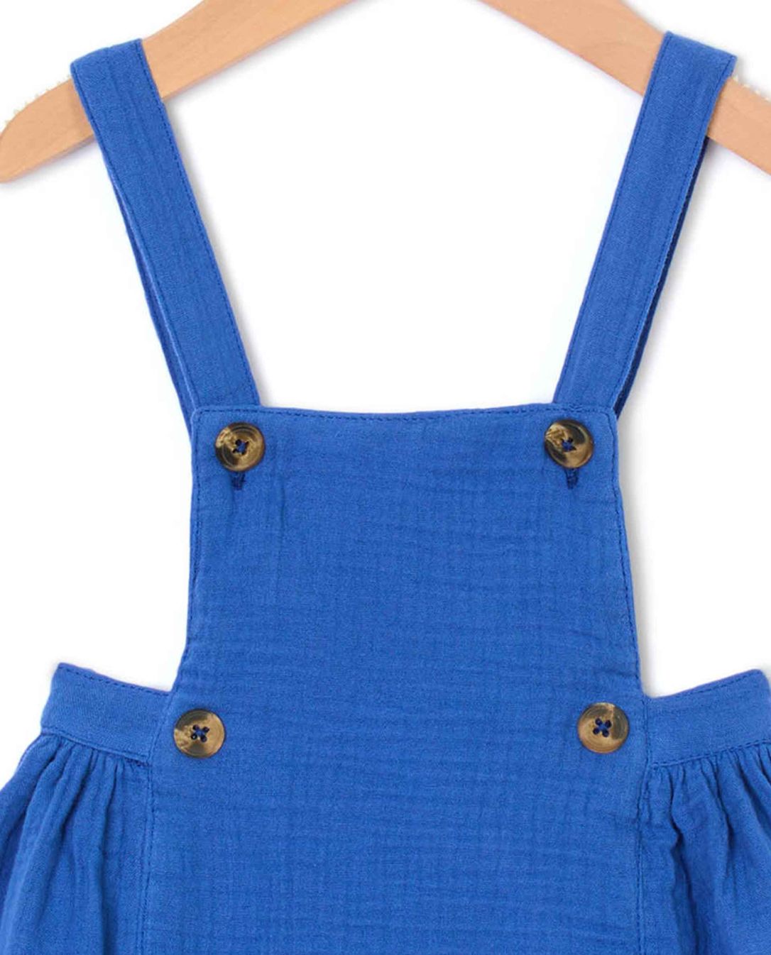 Culotte bouffante en double gaze de coton. Bas de jambe élastiqué. Bretelles croisées au dos se boutonnant devant dans la bavette. On adopte la gaze de coton pour sa légèreté et son aspect légèrement gaufré. 100% coton.