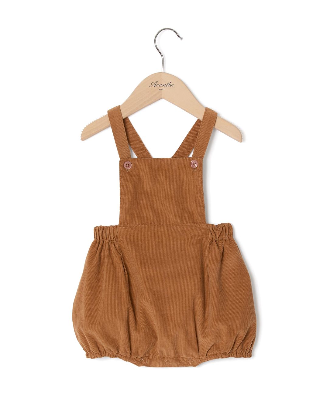 Culotte bouffante en velours. Bas de jambe élastiqué. Bretelles croisées au dos se boutonnant devant dans la bavette. Pur coton. 100% coton.