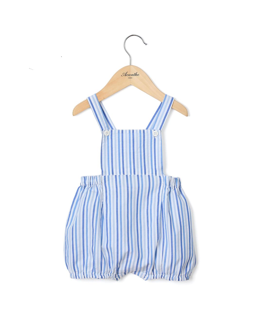 Culotte bouffante. Bas de jambe élastiqué. Bretelles croisées au dos se boutonnant devant dans la bavette. 100% coton.