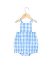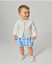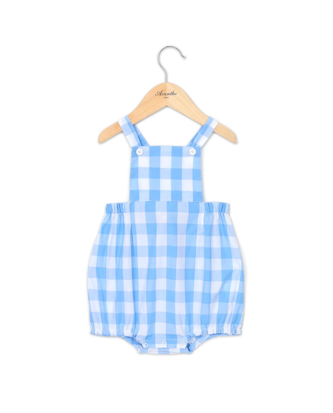 Culotte bouffante. Bretelles croisées au dos se boutonnant devant dans la bavette. Bas de jambe élastiquée. Boutons pression à l'entrejambe. Popeline coton.