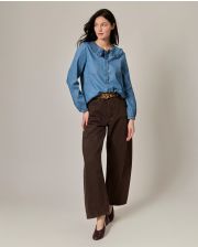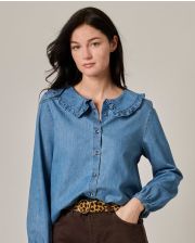 Blouse manches longues. Grand col volanté. Manches froncées au poignet. Denim coton. Longueur totale 66 cm en taille 1. Le mannequin mesure 1,77m et porte une taille 1.