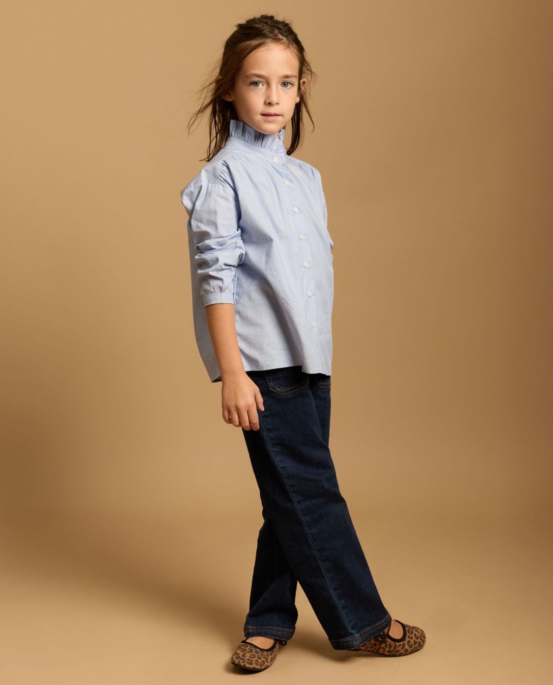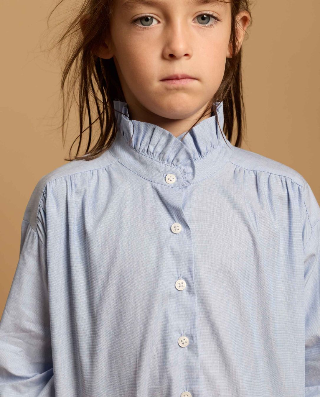 Blouse manches longues avec col volanté corolle et épaules tombantes. Tissu fil à fil.