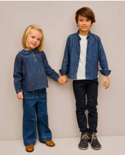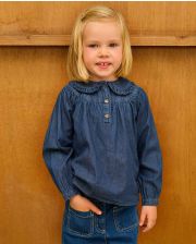 Blouse manches bouffantes en denim. Emmanchure raglan. Plastron arrondi devant et dos. Boutonnage milieu devant. 100% coton.