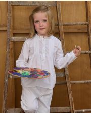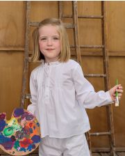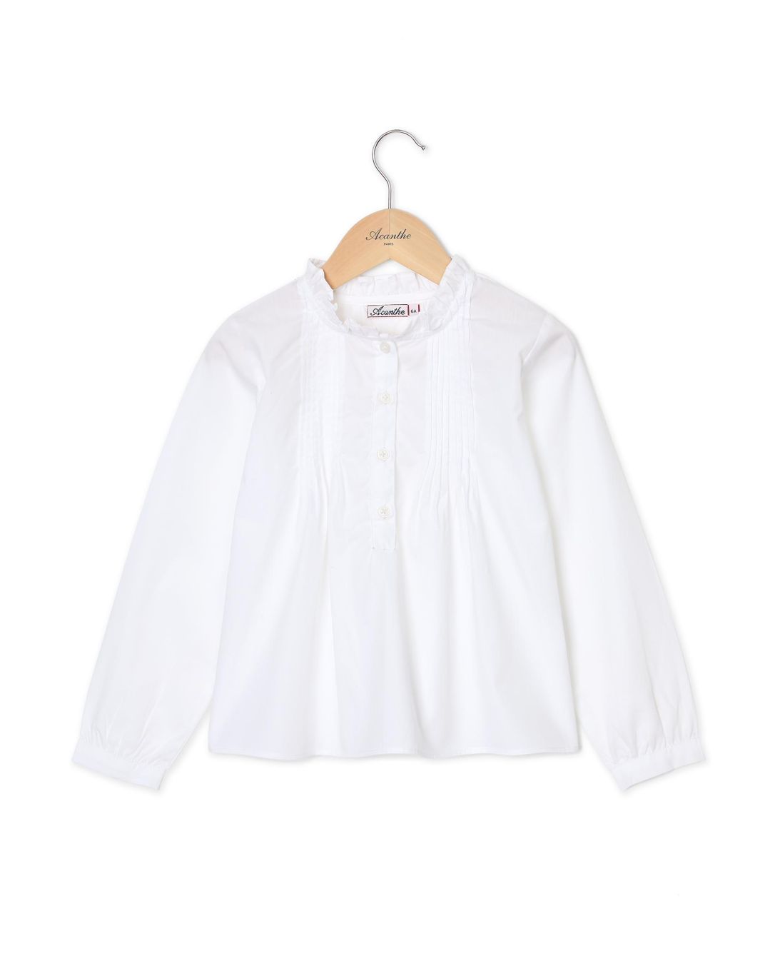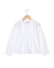 Blouse manches longues encolure ronde avec petit volant. Nervures sous l'encolure. Popeline coton.
