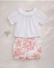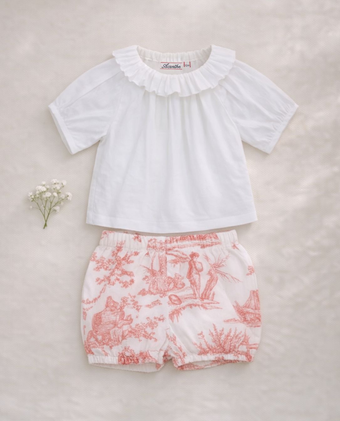 Blouse col volanté. Manches courtes ballon. Volant brodé. Boutonnage dos.