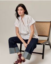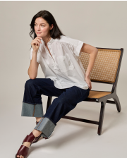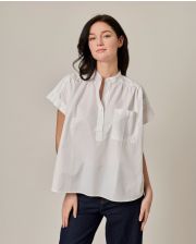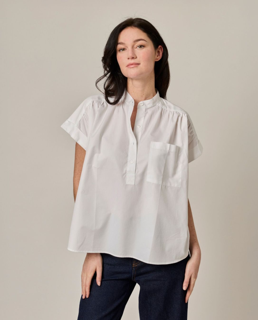 Blouse ample col mao. Manches courtes avec un revers. Epaules tombantes. Fronces légères au devant et au dos. Popeline coton. Taille unique. Longueur totale 65 cm. Le mannequin mesure 1,77m et porte une taille unique.