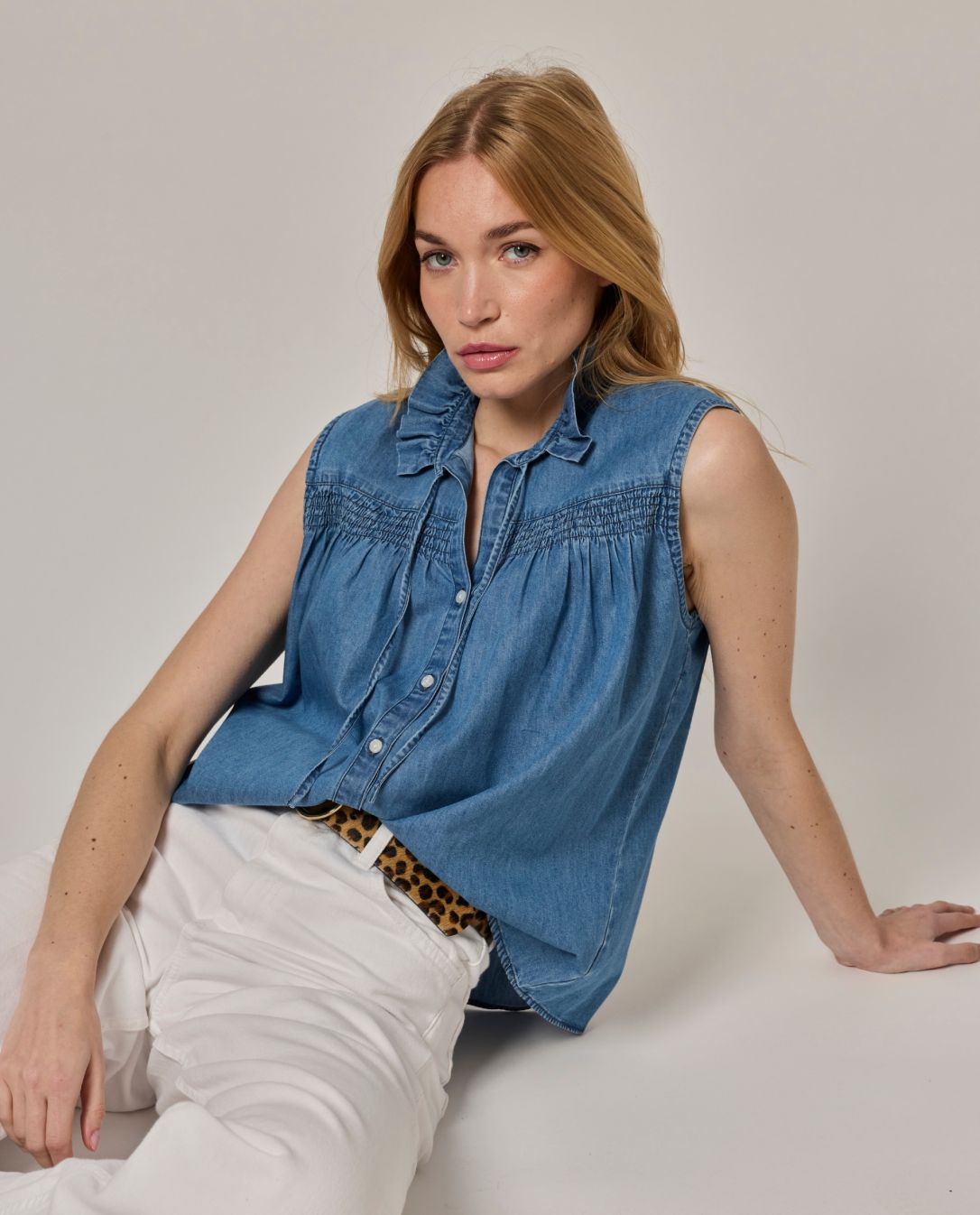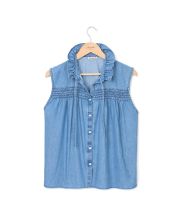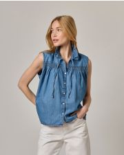 Blouse sans manches. Col volanté. 2 liens devant pour fermer le col. Boutonnage devant. Denim coton. Longueur totale 58 cm en taille 1. Le mannequin mesure 1,73m et porte une taille 1.