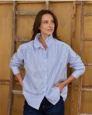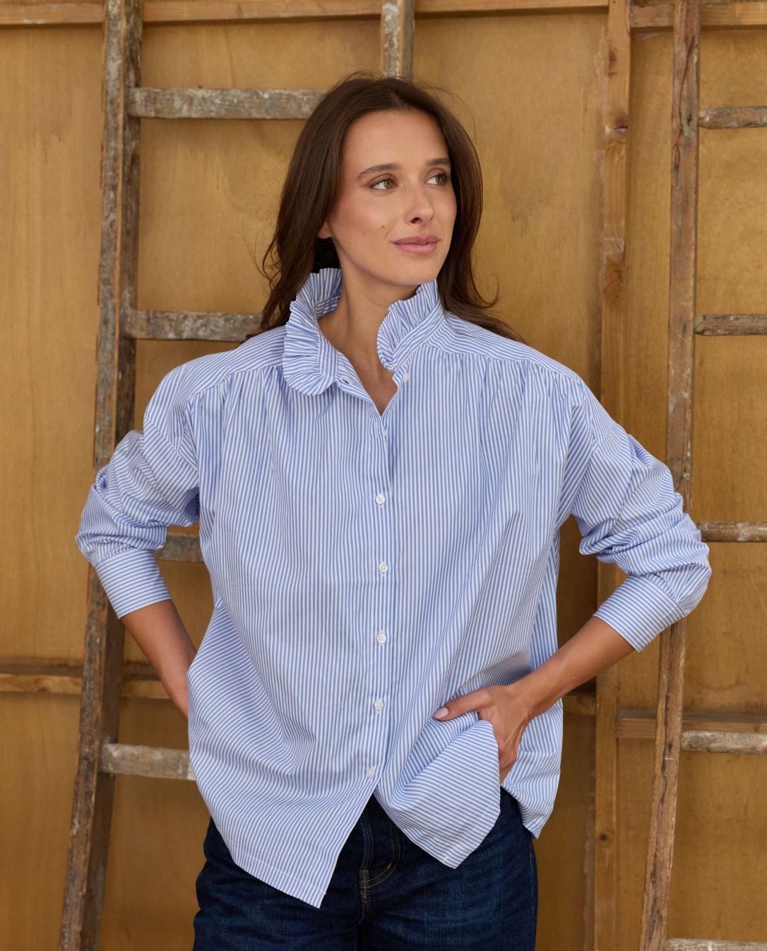Blouse loose avec col volanté corolle et épaules tombantes. Popeline coton. Taille unique. Le mannequin mesure 1,75m.