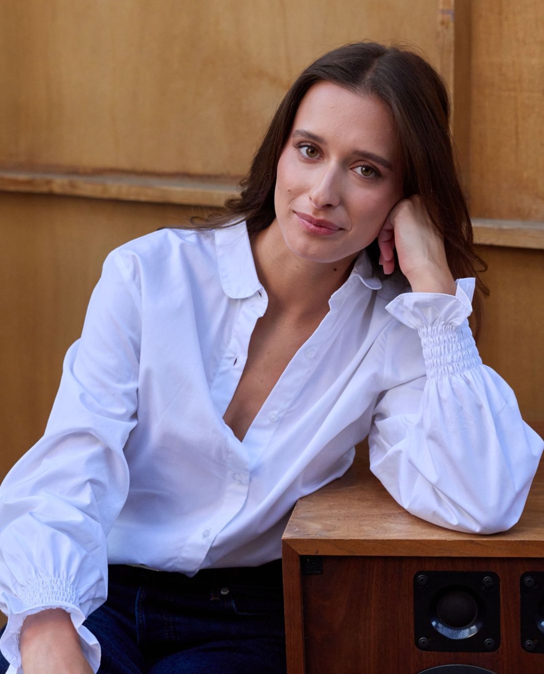 Blouse col rond. Manches longues et larges se terminant par des poignets smockés volantés. Popeline coton. Le mannequin mesure 1,75m et porte une taille 1.