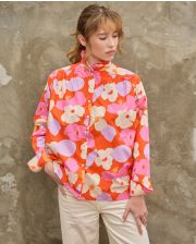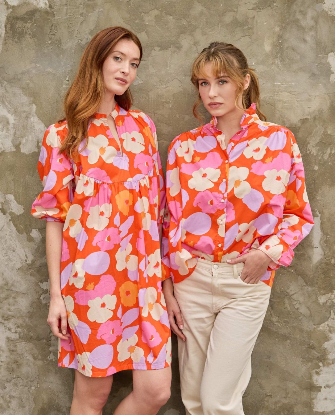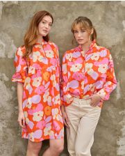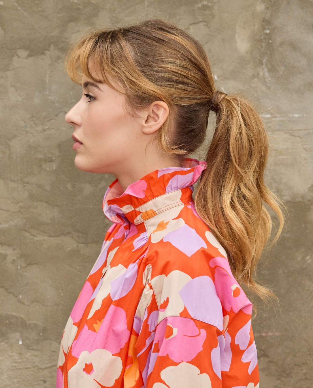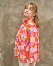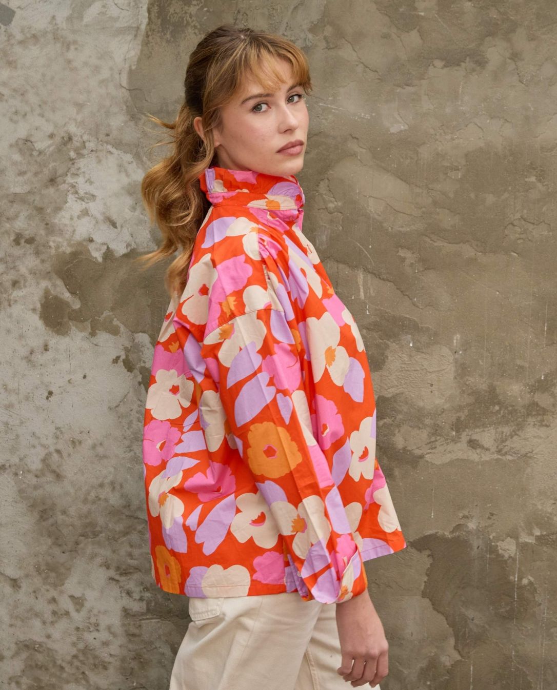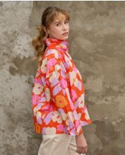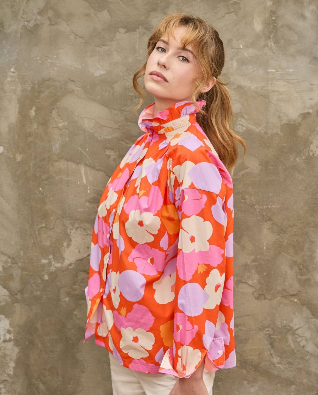 Blouse loose avec col volanté corolle et épaules tombantes. Tissu Liberty popeline lourde Picadilly. 100% coton. Longueur depuis l'épaule : 77 cm. Taille unique.Le mannequin mesure 1m73. .