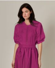 Blouse romantique avec galons. Popeline coton uni. Manches courtes bouffantes. Plis nervurés et galons au devant et aux manches. Fermeture 1 bouton au dos. Coordonnée à la jupe ARABELLA.