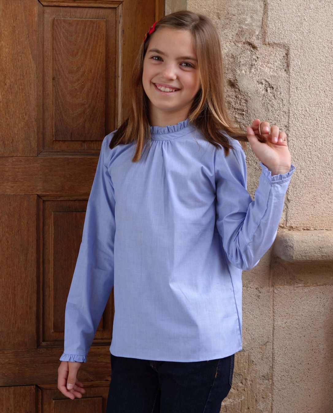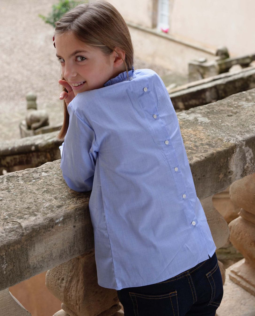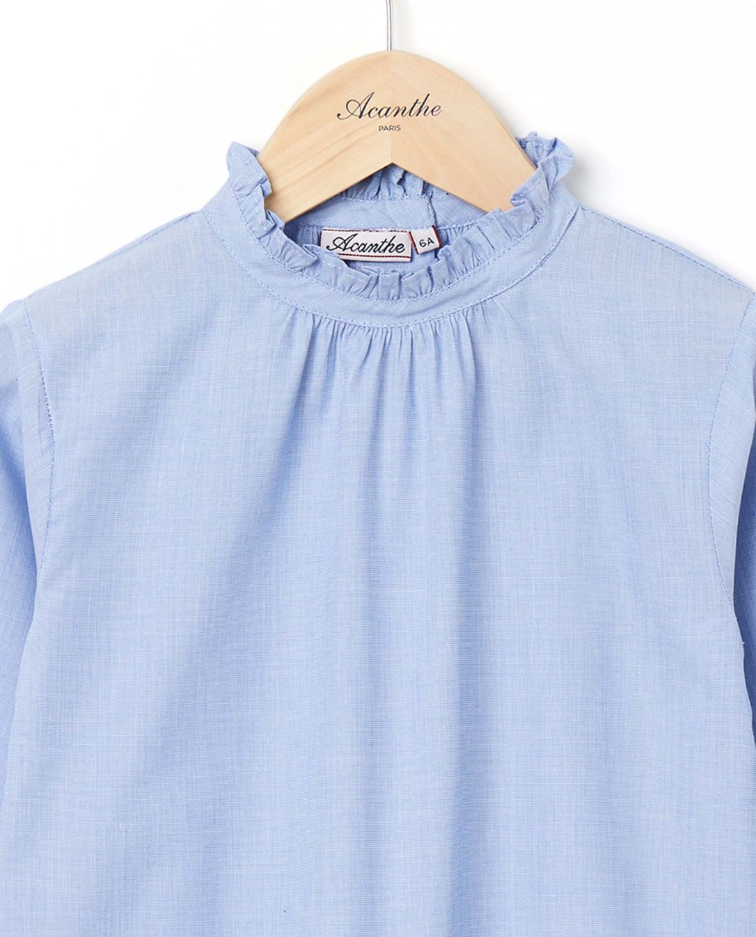 Blouse en fil à fil de coton. Petit volant au col. Manches longues finies par un volant. Boutonnage dos.