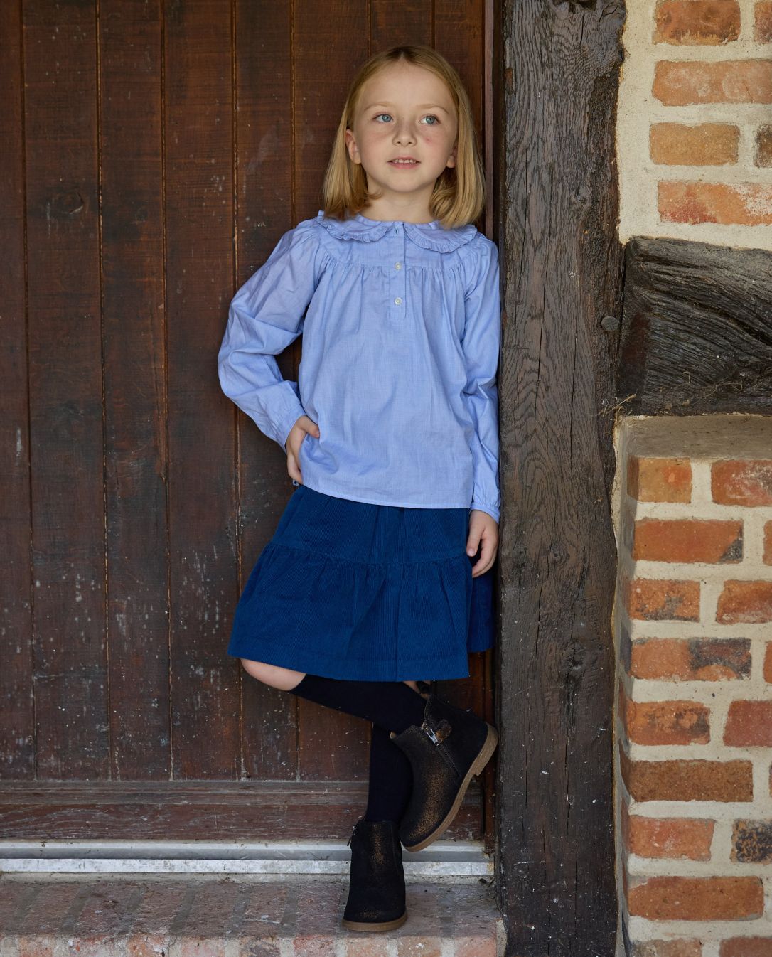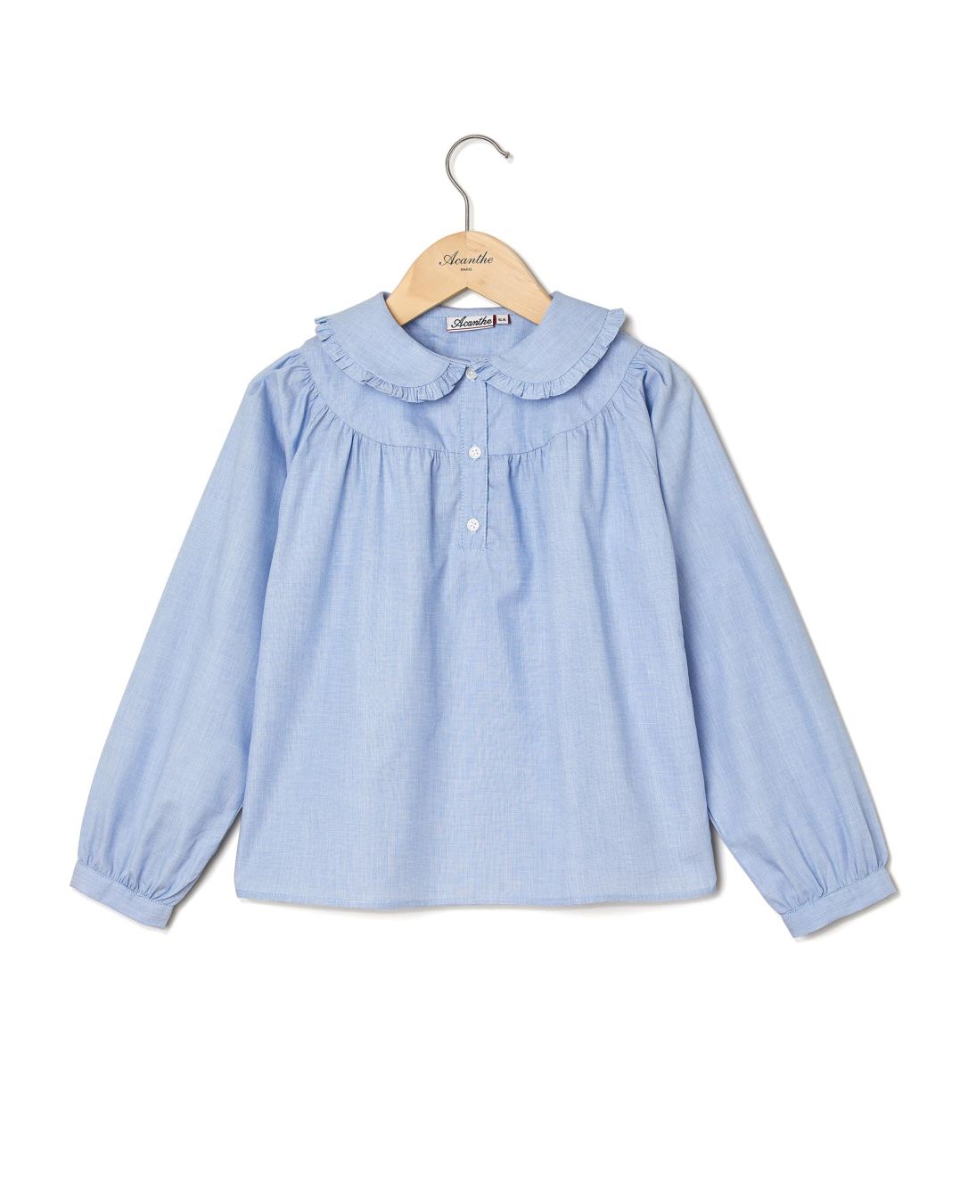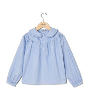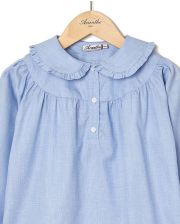 Blouse manches bouffantes en fil à fil. Emmanchure raglan. Plastron arrondi devant et dos. Boutonnage milieu devant.