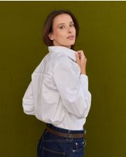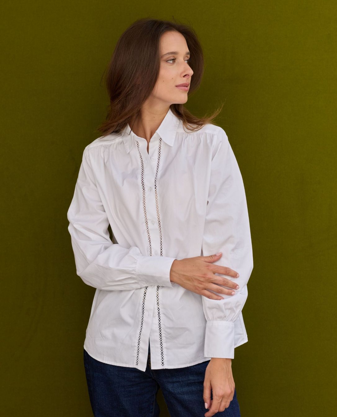 Blouse manches bouffantes avec galon incrusté de chaque coté de la patte de boutonnage et au dos. Popeline coton. Le mannequin mesure 1,75m et porte une taille 1.