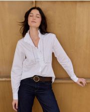 Blouse avec volant au col et demi patte de boutonnage. Galon incrusté au devant. Popeline coton. Le mannequin mesure 1,77m et porte une taille 38.