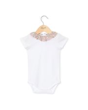 Body manches courtes. Boutons pression à l'entrejambe. Col volanté en tissu Liberty. 100% coton.