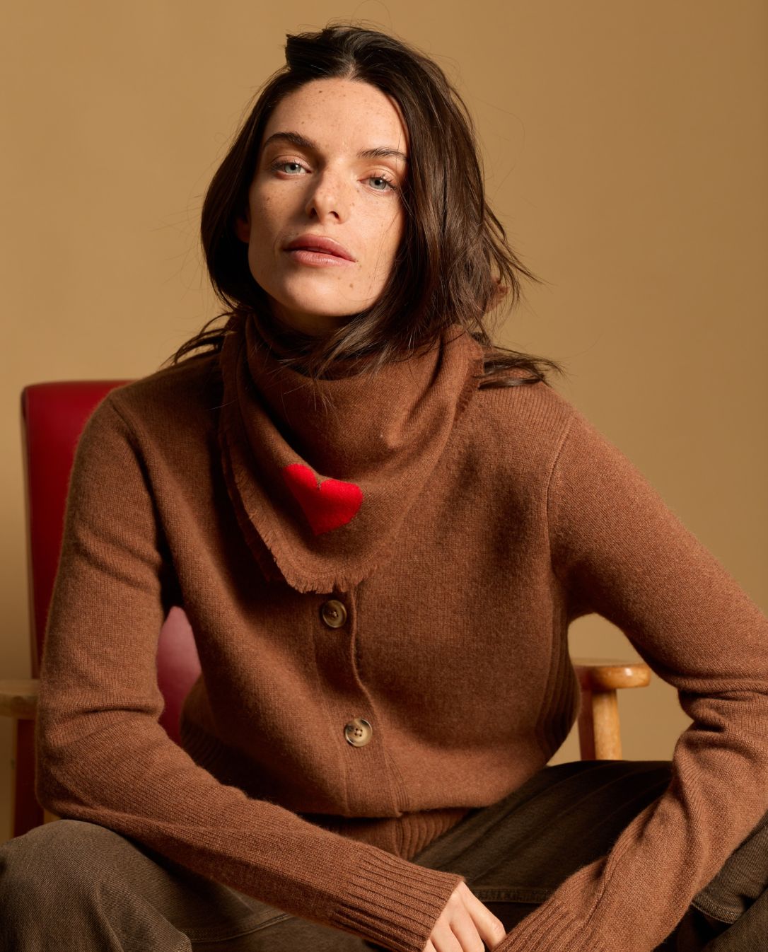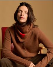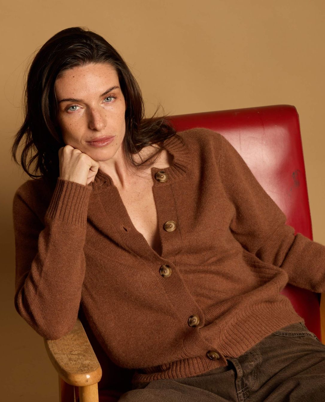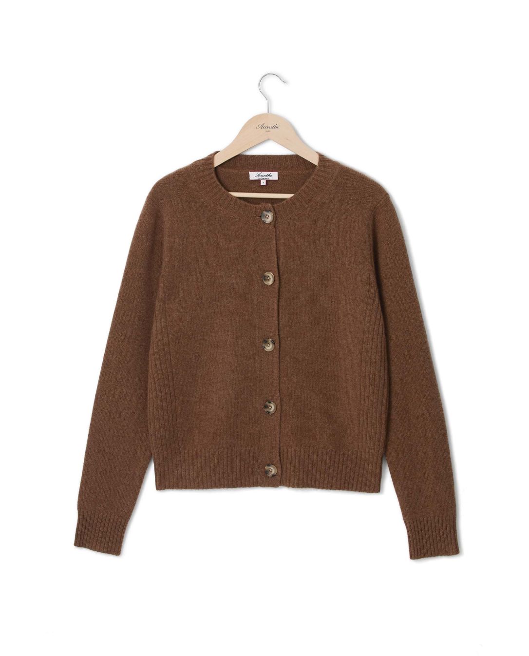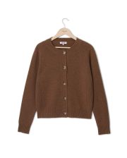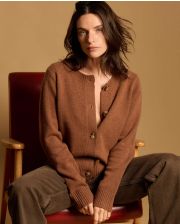 Cardigan court encolure ronde en cachemire double fil. Large finition bord côtes. Longueur épaule 56 cm (taille 1 à 3). Le mannequin mesure 1,70m et porte une taille 1.