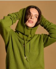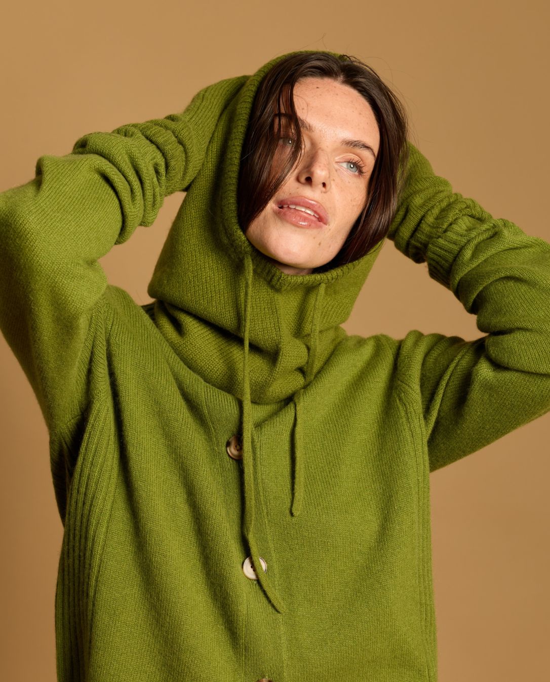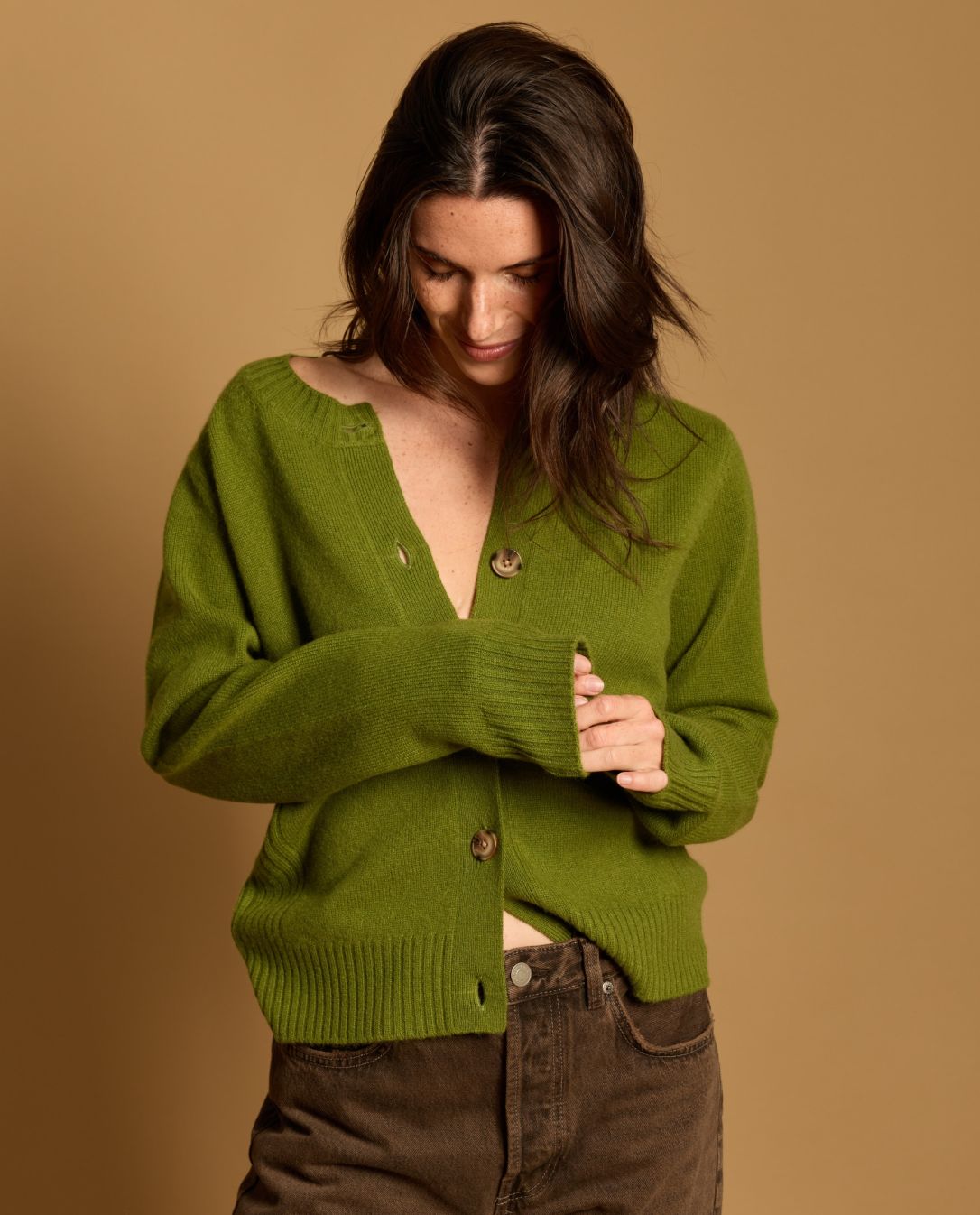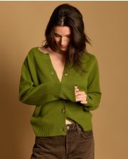 Cardigan court encolure ronde en cachemire double fil. Large finition bord côtes. Longueur épaule 56 cm (taille 1 à 3). Le mannequin mesure 1,70m et porte une taille 1.
