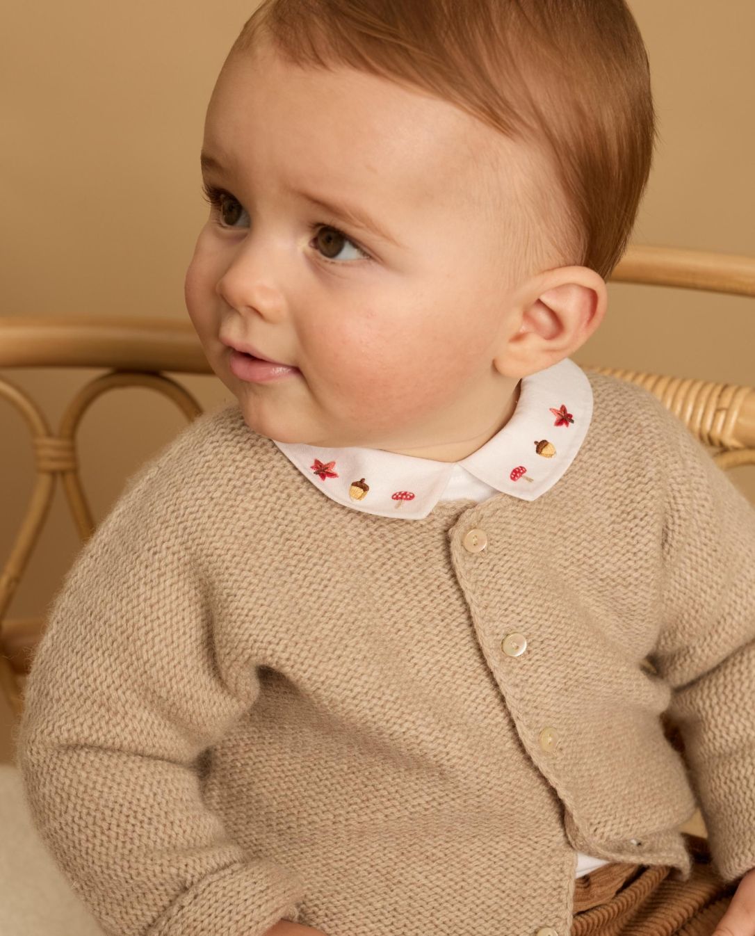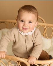 Cardigan point mousse bébé (jersey envers). Boutonné au milieu devant. Emmanchure kimono. Pure laine d'agneau.