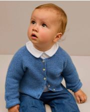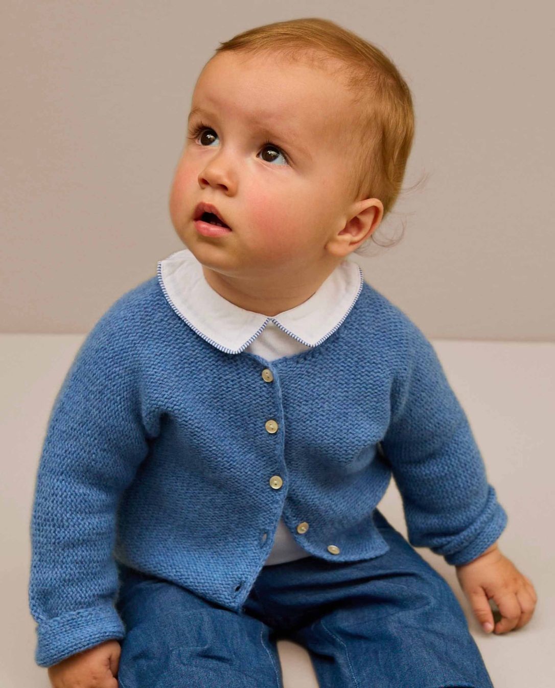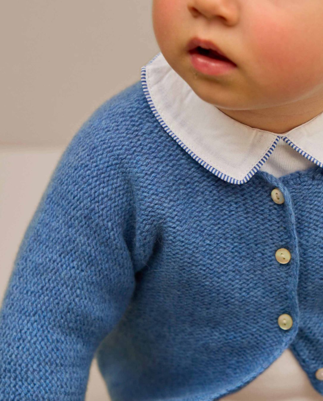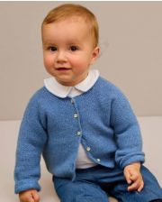 Cardigan point mousse bébé (jersey envers). Boutonné au milieu devant. Emmanchure kimono. Pure laine d'agneau. 100% lambswool.