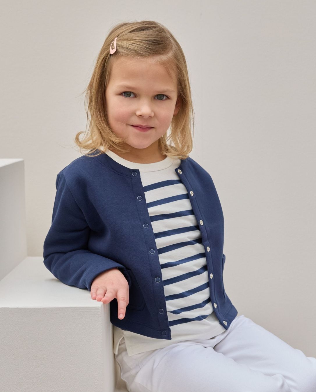 Cardigan fille en molleton. Encolure ronde. Manches longues. Boutons pression au devant.80% coton - 20% polyester.