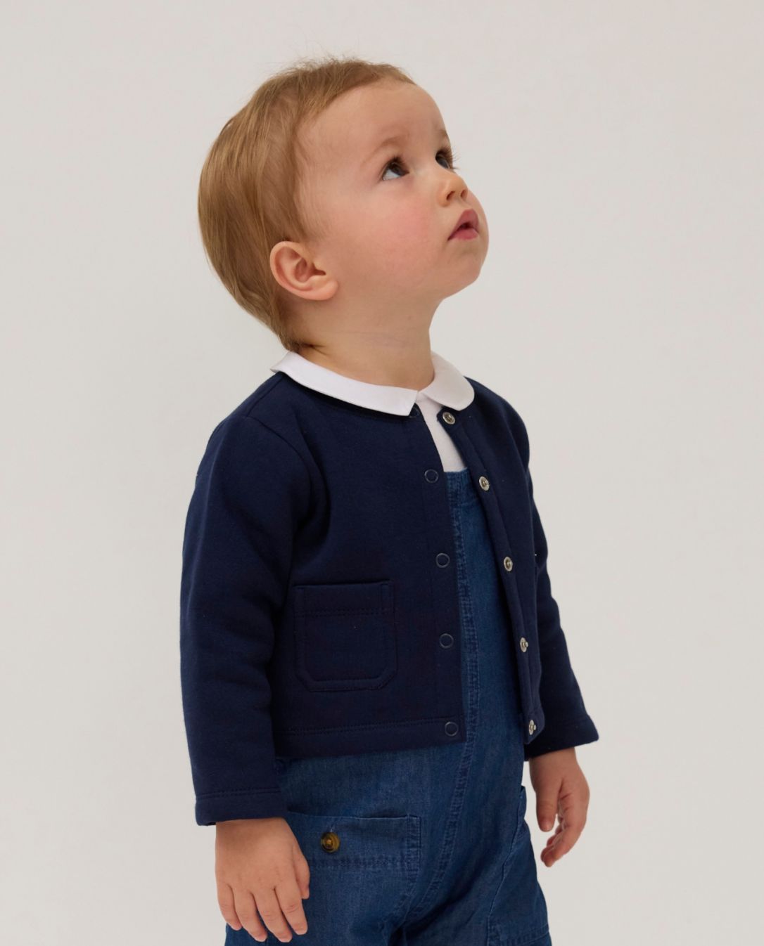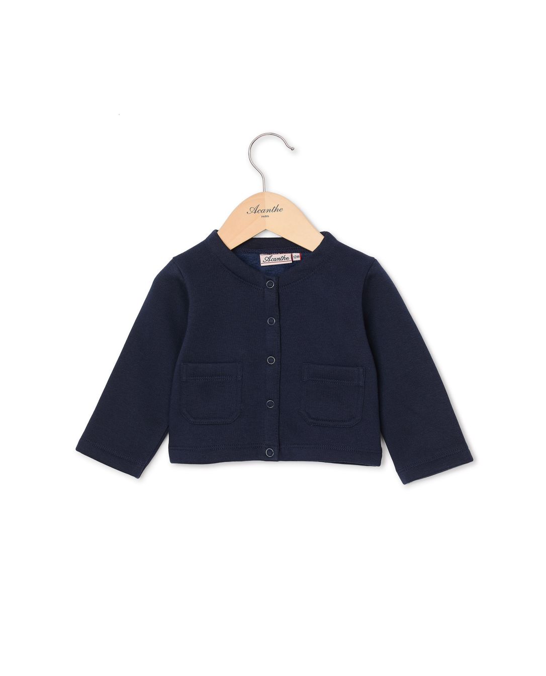 Cardigan bébé en molleton. Encolure ronde. Manches longues. Boutons pression au devant. 80% coton - 20% polyester.