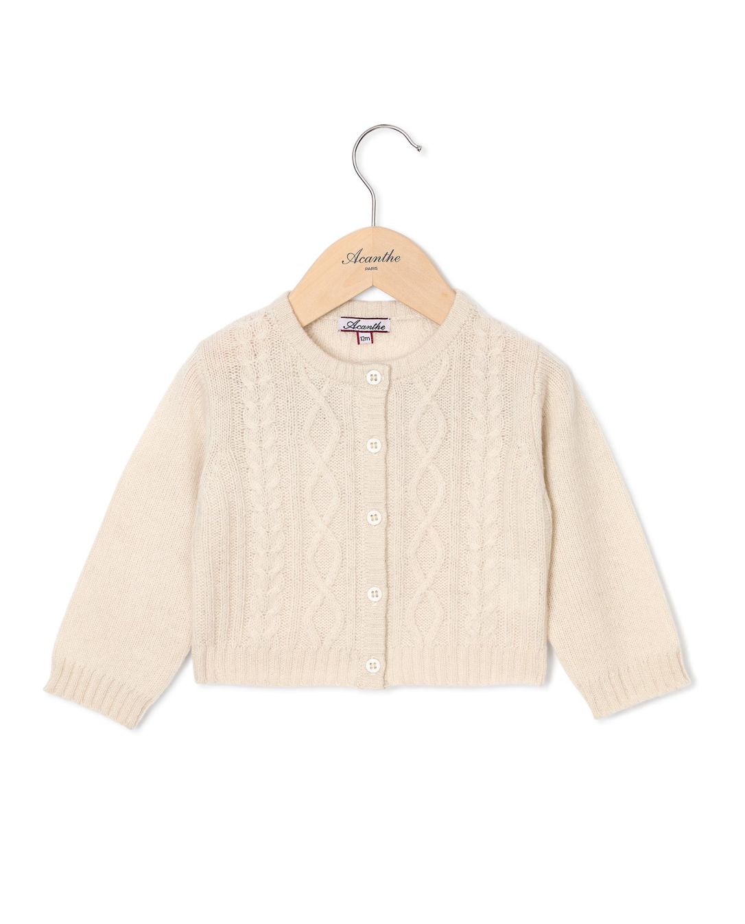 Cardigan encolure ronde avec torsades devant et dos. Boutonnage milieu devant. Finition bord côtes.