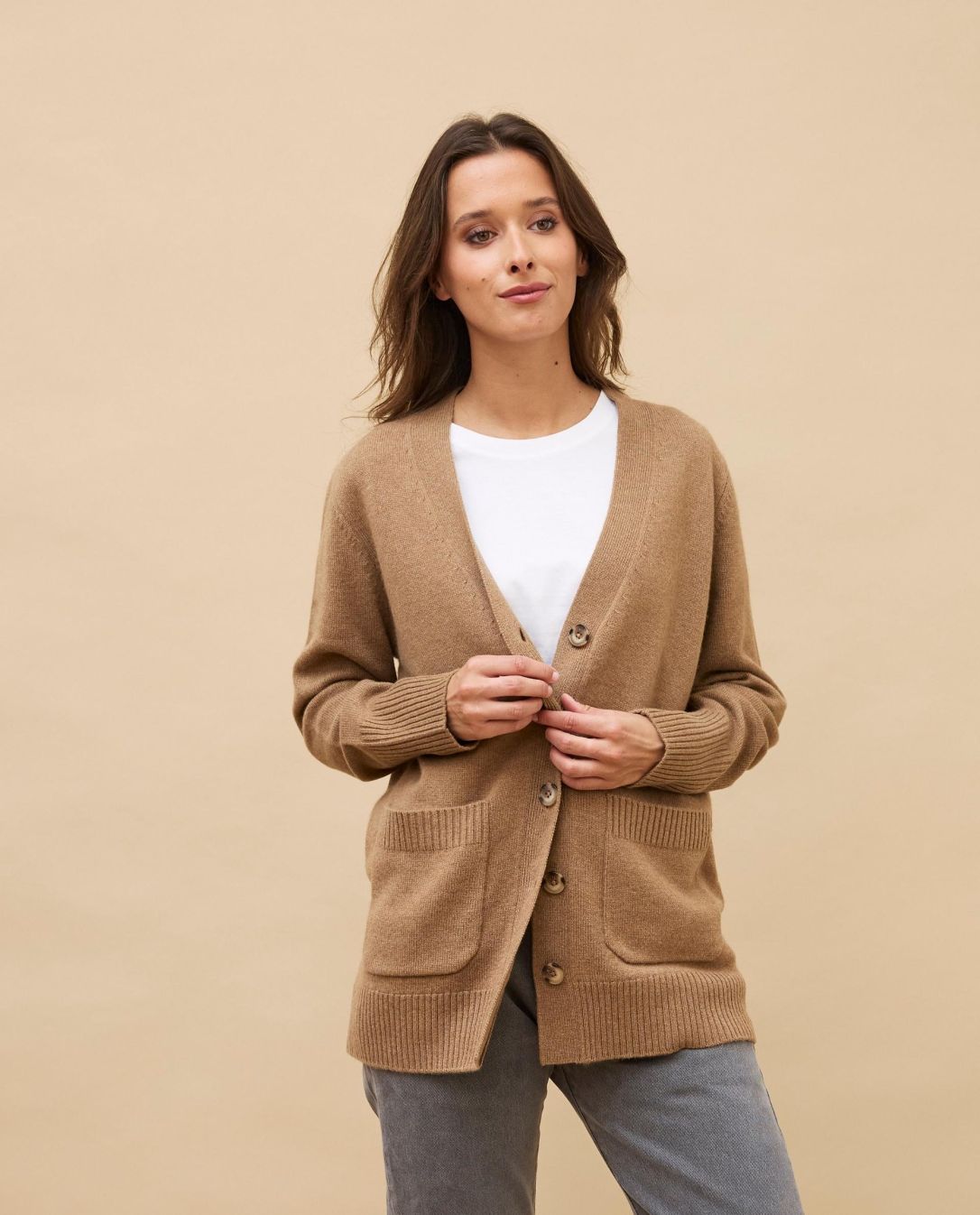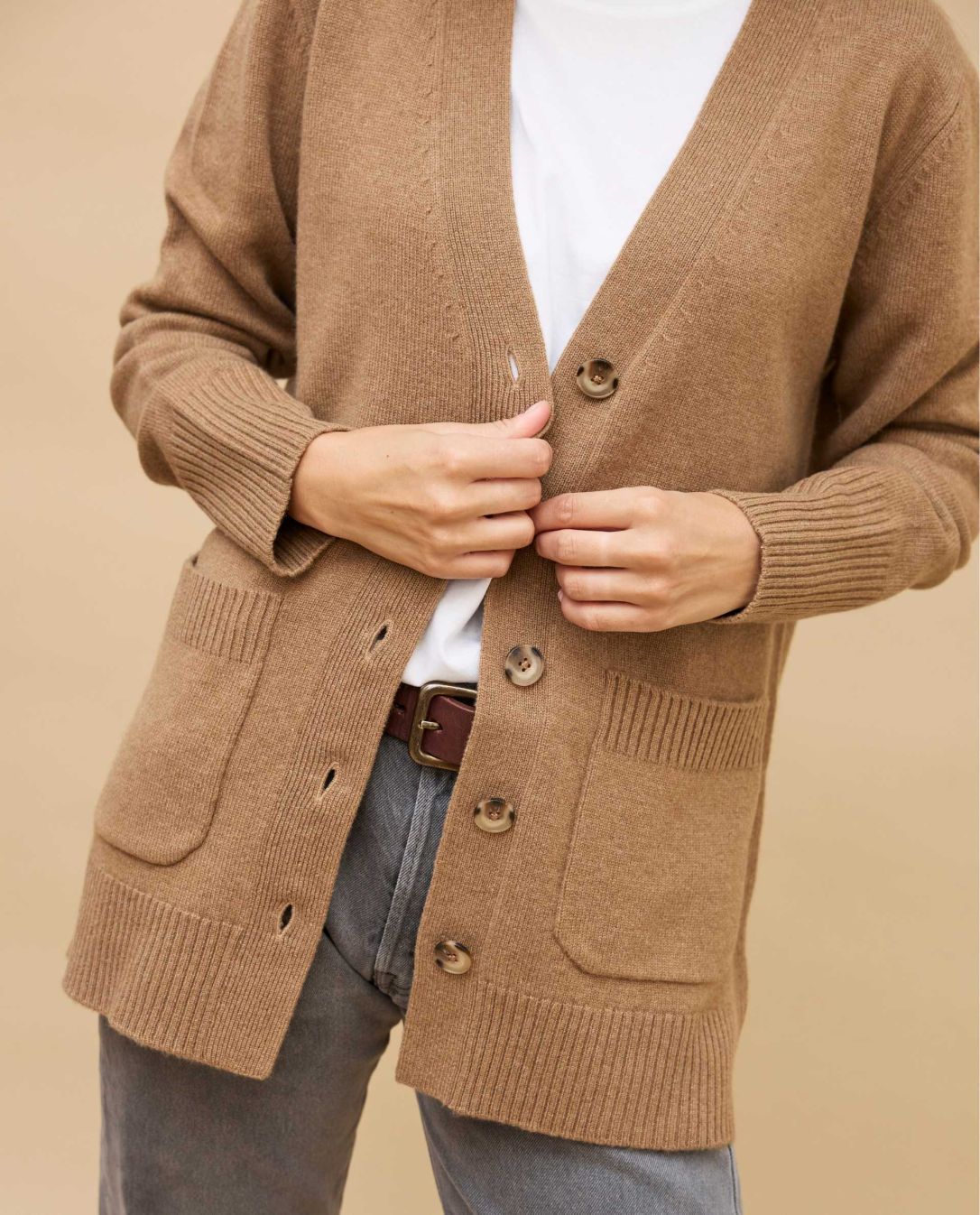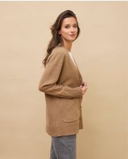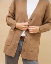 Cardigan long encolure V en cachemire double fil. Deux poches plaquées. Finition larges bord-côtes. 100% cachemire.