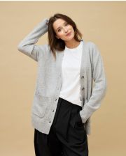 Cardigan long encolure V en cachemire double fil. Deux poches plaquées. Finition larges bord-côtes. 100% cachemire.