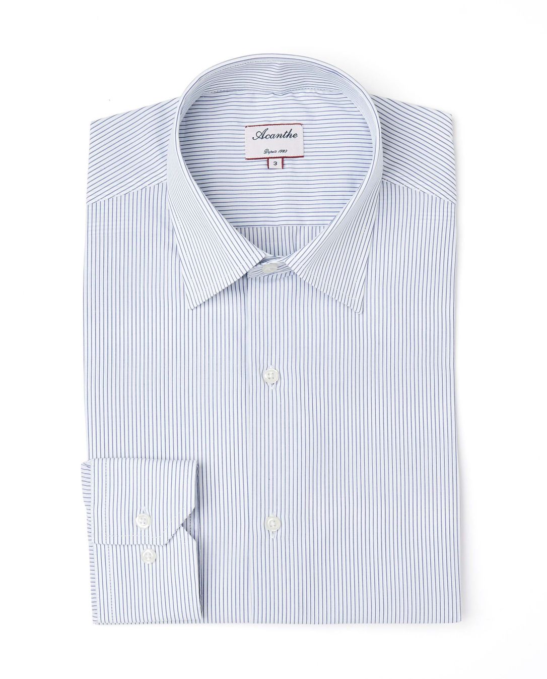 Chemise col italien. Manches longues. 2 plis souples carrure dos. Pans arrondis au bas.