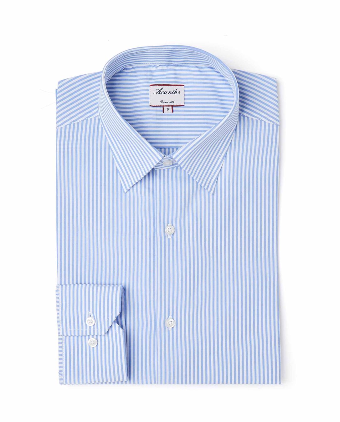 Chemise col italien. Manches longues. 2 plis souples carrure dos. Pans arrondis au bas.