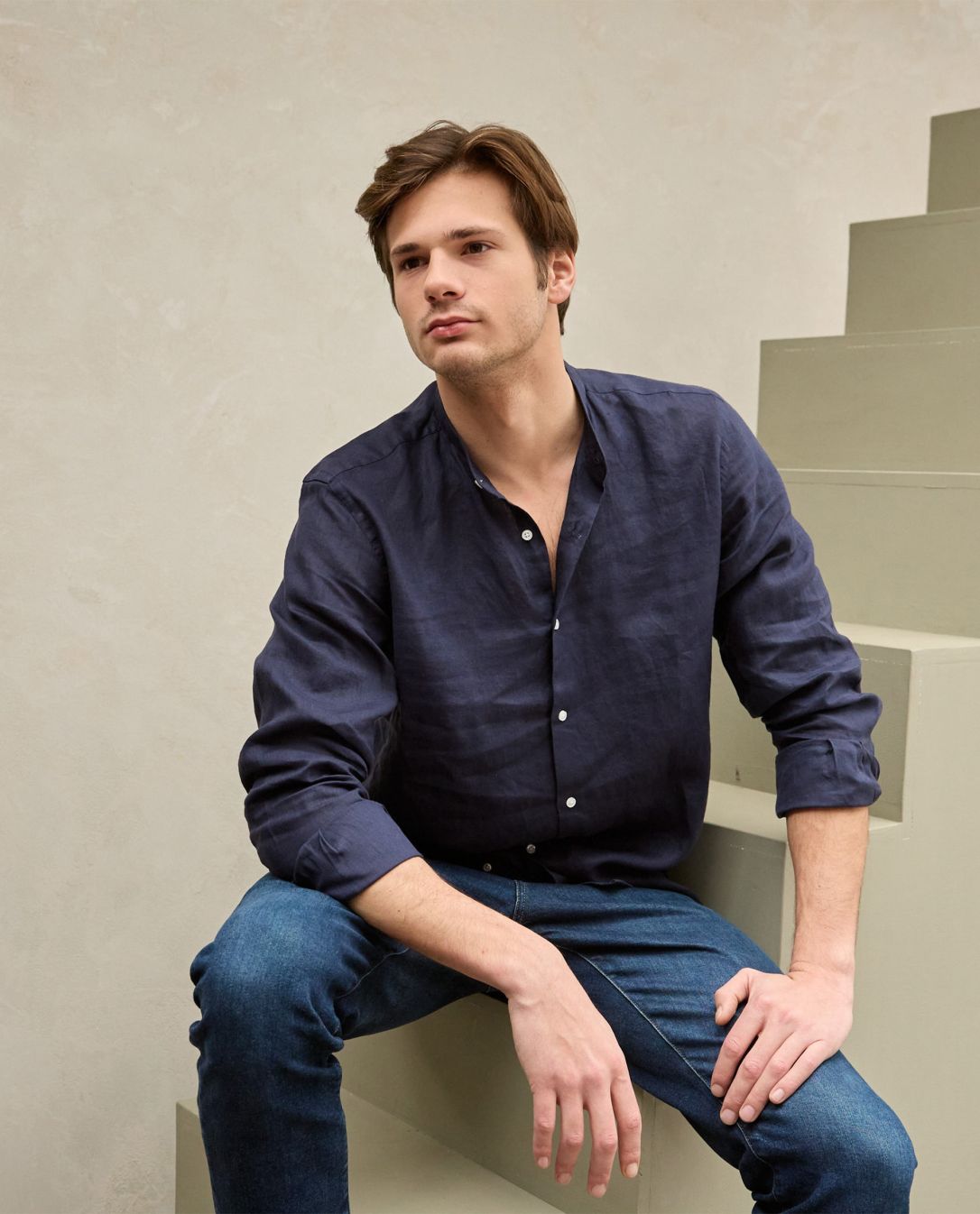 Chemise col mao manches longues. Pans arrondis au bas. 100% pur lin. Le lin est une fibre naturelle, résistante et anallergique. C’est une matière respectueuse de la nature car le lin ne nécessite aucune irrigation : il trouve l’eau directement dans le sol et les précipitations. 100% lin.