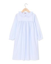 Col claudine, taille haute et manches longues bouffantes resserrées au bas par un élastique. 100% coton.