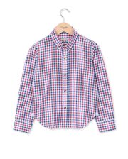 Chemise garçon. Manches longues. Poche poitrine. Pans arrondis au bas. 100% coton.