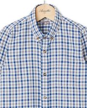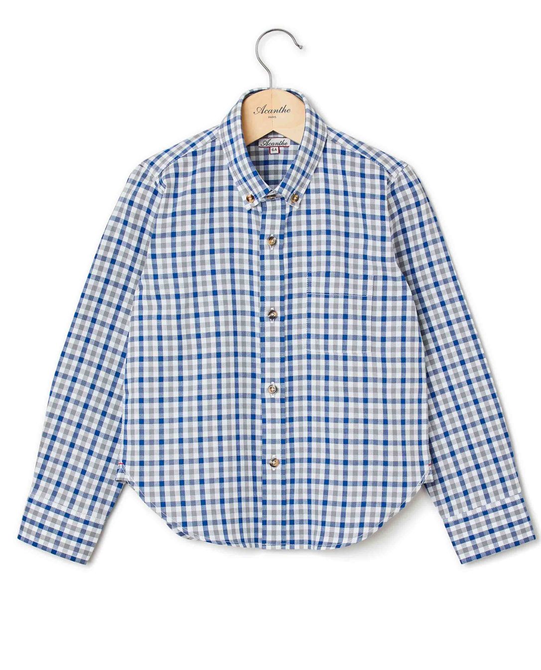 Chemise garçon. Manches longues. Poche poitrine. Pans arrondis au bas.