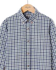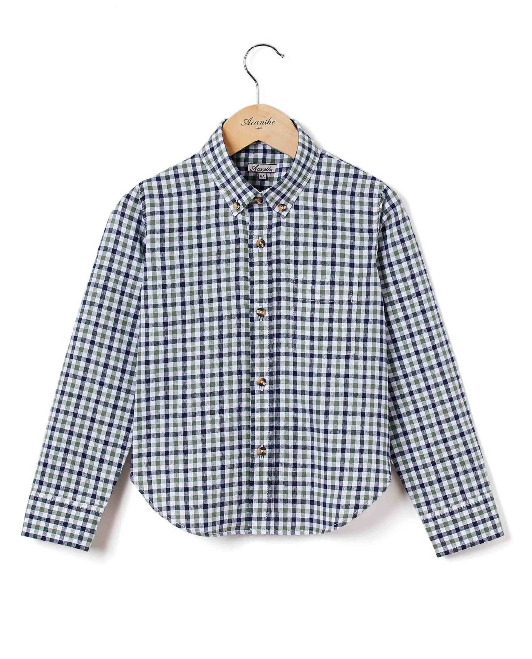 Chemise garçon. Manches longues. Poche poitrine. Pans arrondis au bas.