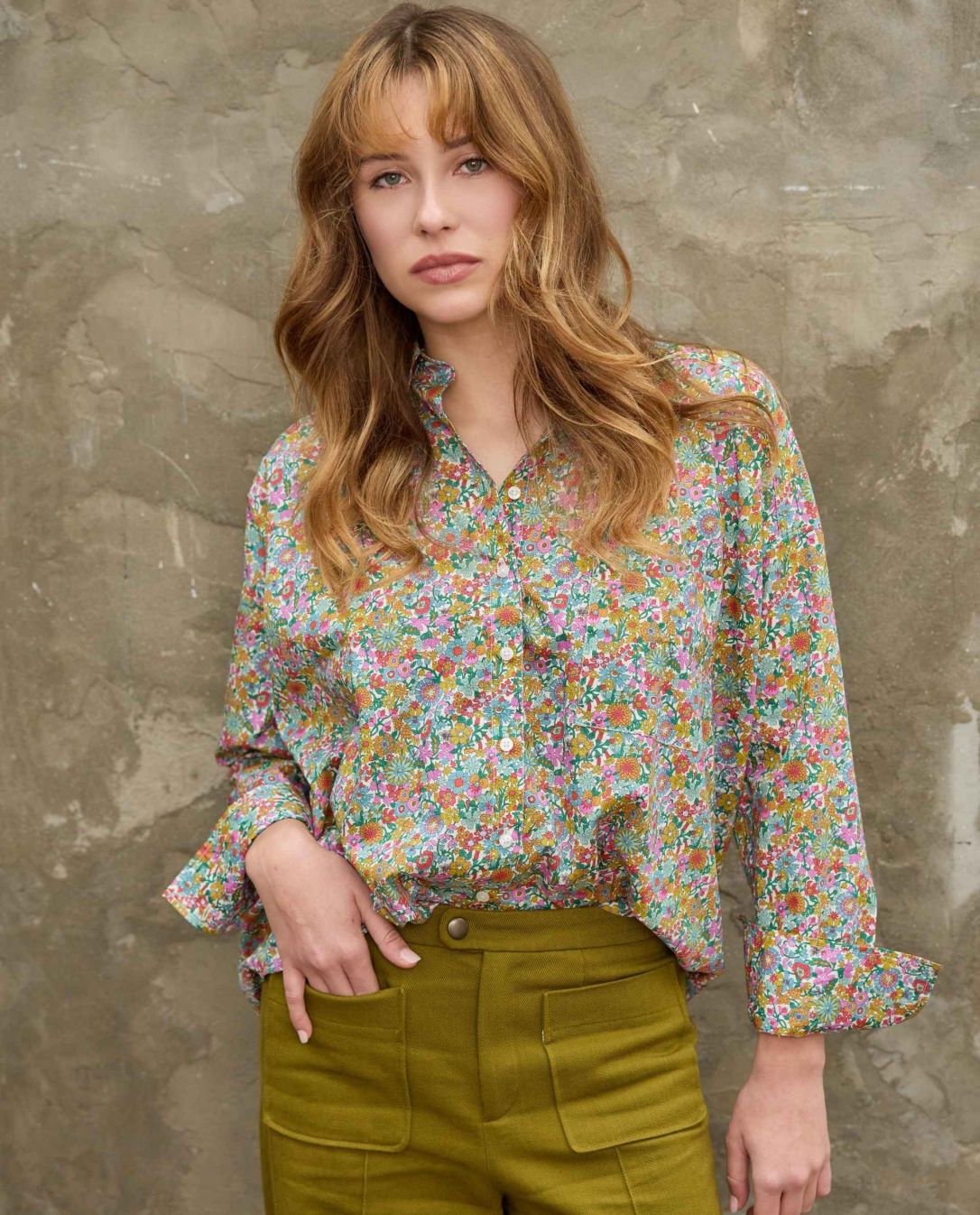 Chemisier manches longues oversize. Epaules tombantes. Pli creux au dos. Tissu Liberty. 100% coton. Longueur depuis l'épaule : 78 cm. Taille unique.Le mannequin mesure 1m73. .