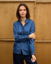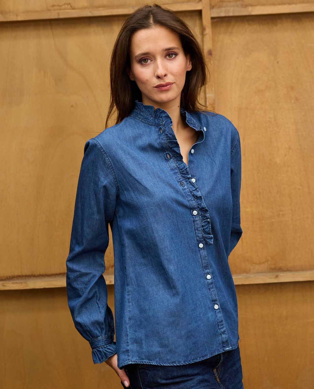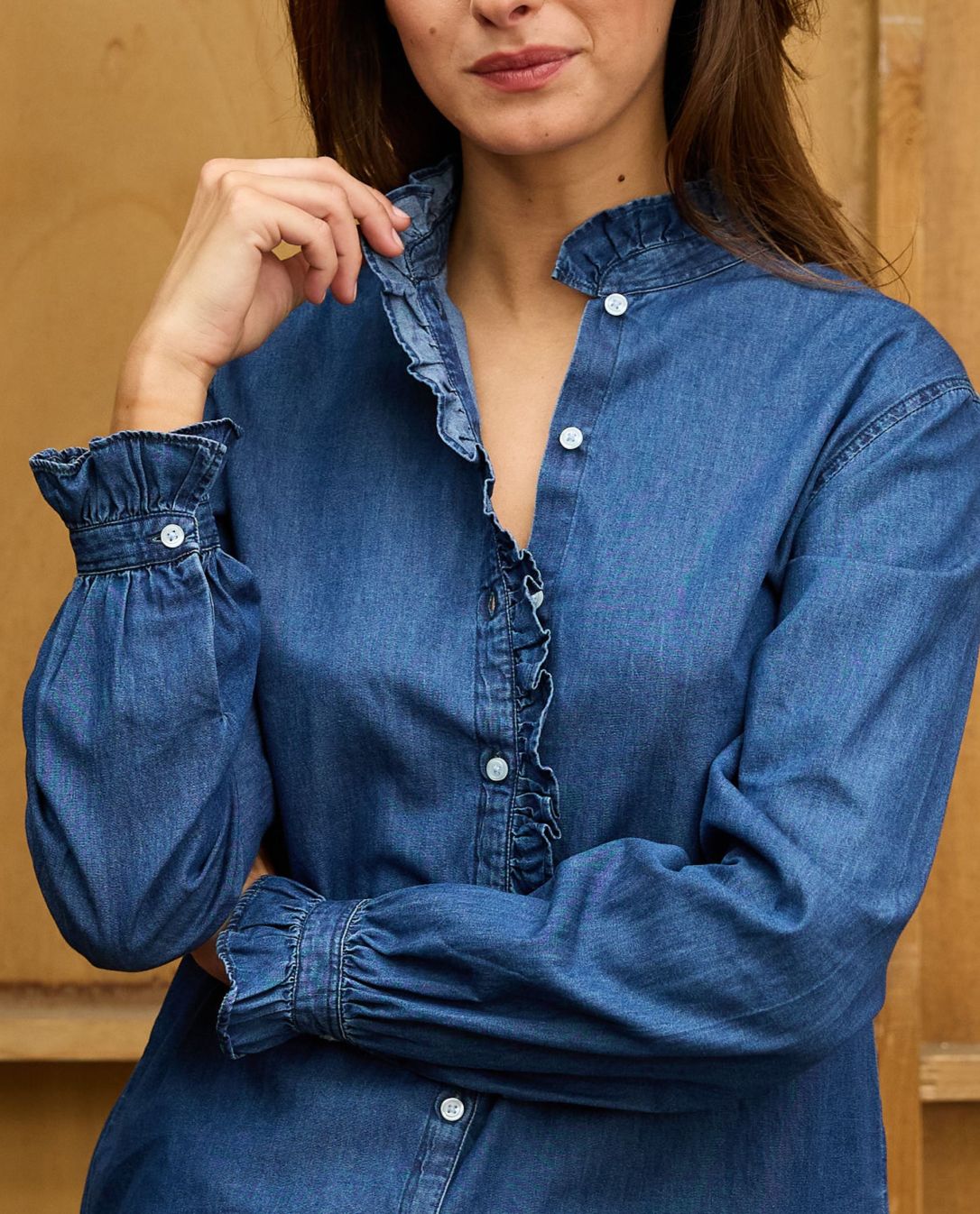 Chemisier avec volants au col, aux manches et demi patte de boutonnage. Denim 100% coton. Le mannequin mesure 1m75 et porte une taille 1. 100% coton.
