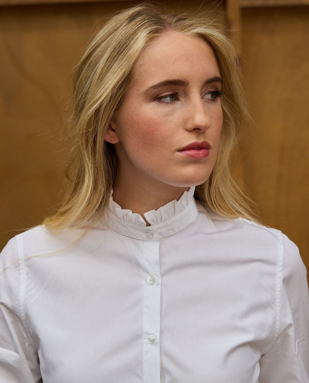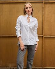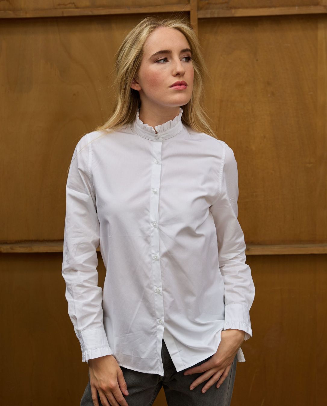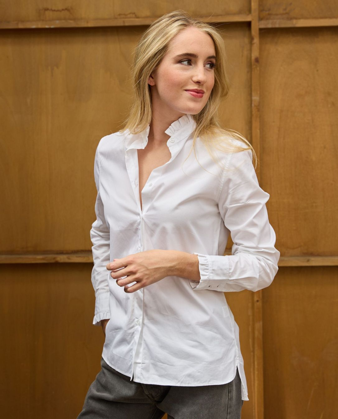 Chemisier manches longues avec petit volant au col et aux poignets. Le coton est une fibre végétale, hypoallergénique. Cest une matière avec un bon pouvoir absorbant et isolant : il supporte bien la