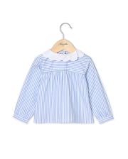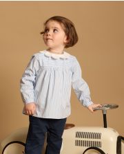 Chemisier en popeline de coton. Encolure ronde avec un col pétale blanc. Boutonnage milieu dos. Manches longues resserrées par un bracelet boutonné.