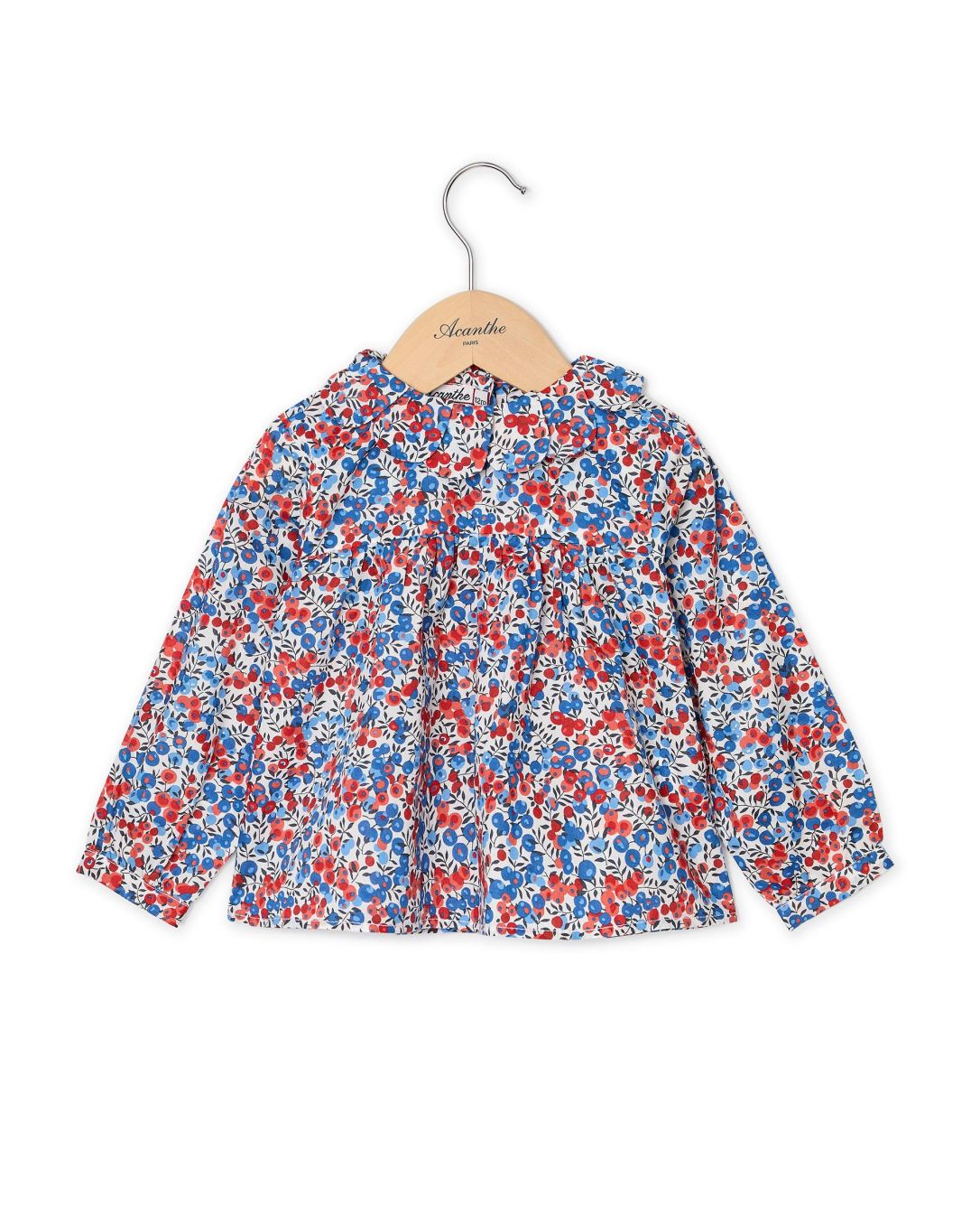 Chemisier en coton Liberty. Encolure ronde avec un col pétale. Boutonnage milieu dos. Manches longues resserrées par un bracelet boutonné.