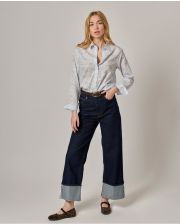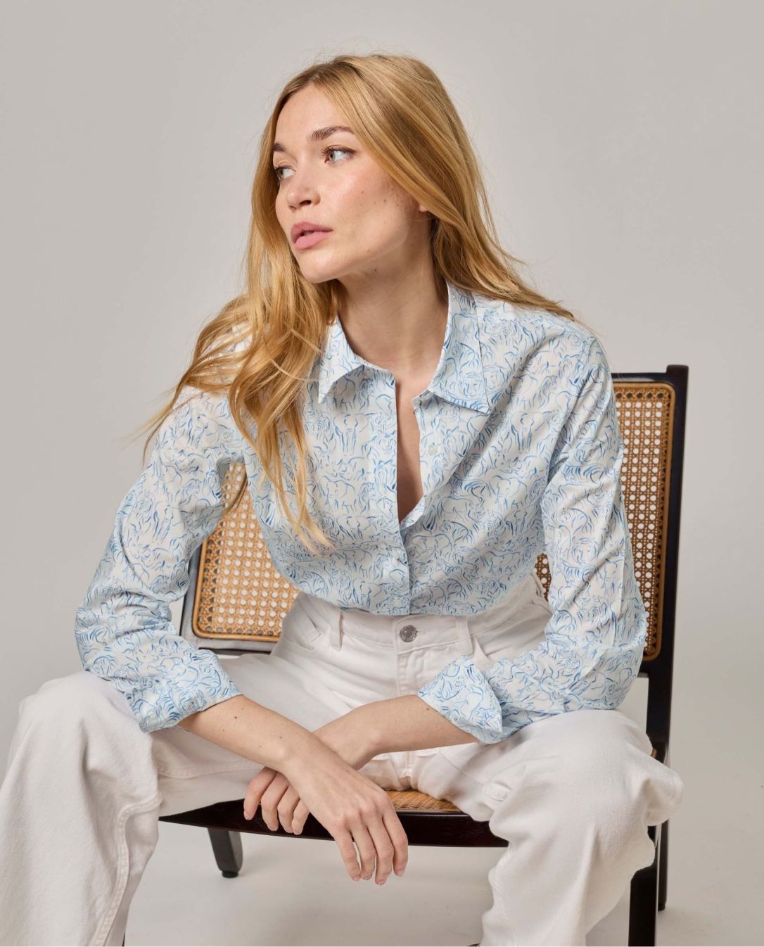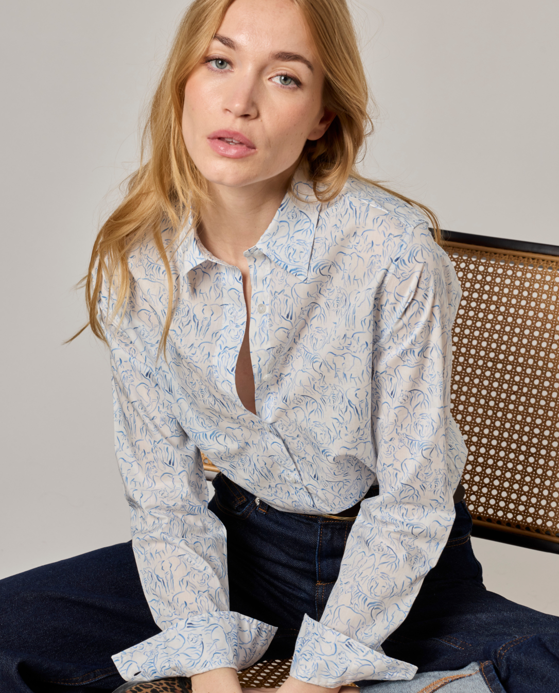 Chemisier classique. Manches longues. Pli rond au dos. Tissu Liberty Yusuf. Longueur totale 70 cm toutes tailles. Le mannequin mesure 1,73m et porte une taille 1.