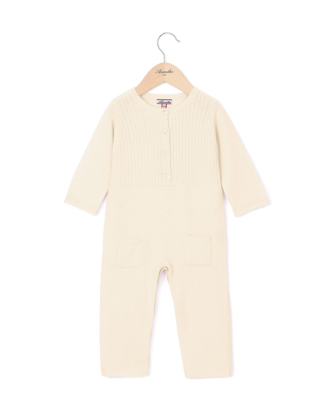Combinaison bébé avec côtes plates, encolure ronde, en laine et cachemire. Maille jersey. Entrejambe avec pressions.