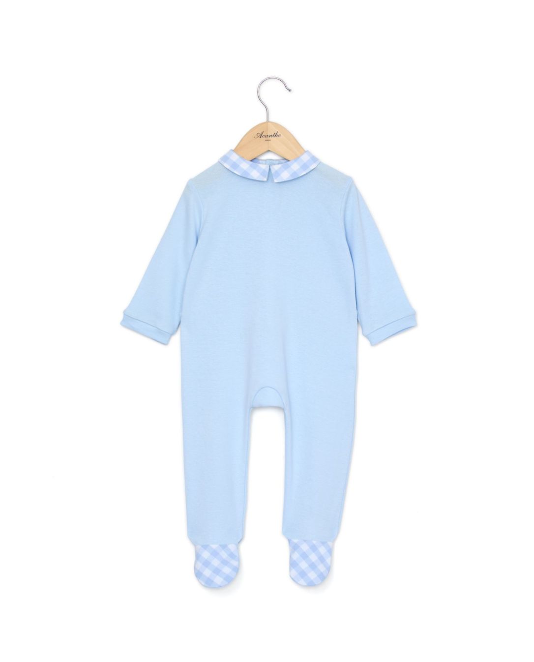 Pyjama bébé en côtes 1x1 coton. Col carré et dessus des pieds en popeline vichy ciel. Boutons pression au dos.